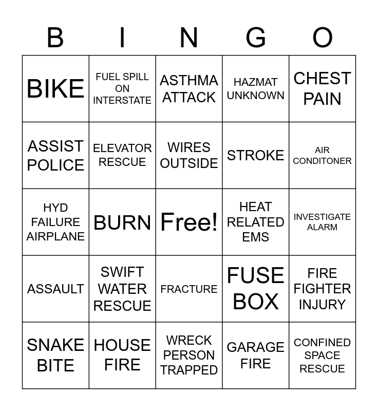 This bingo card has a free space and 24 words: SWIFT WATER RESCUE, HOUSE FIRE, WIRES OUTSIDE, SNAKE BITE, CHEST PAIN, BIKE, ASSIST POLICE, FUEL SPILL ON INTERSTATE, HEAT RELATED EMS, FRACTURE, STROKE, HYD FAILURE AIRPLANE, FUSE BOX, FIRE FIGHTER INJURY, ELEVATOR RESCUE, GARAGE FIRE, INVESTIGATE ALARM, ASTHMA ATTACK, AIR CONDITONER, BURN, CONFINED SPACE RESCUE, ASSAULT, HAZMAT UNKNOWN and WRECK PERSON TRAPPED.