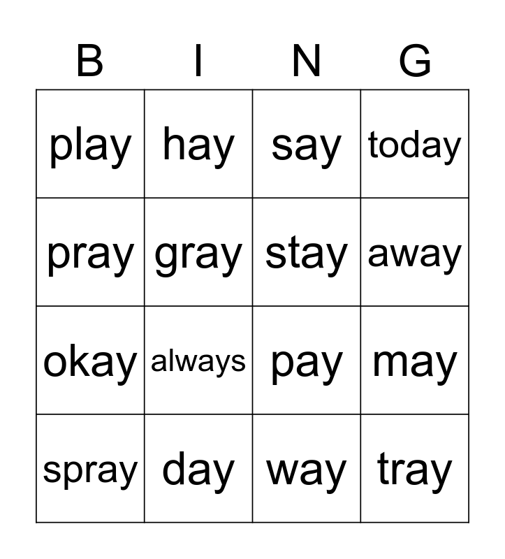 This bingo card has 16 words: day, may, say, play, okay, hay, pay, way, pray, gray, spray, today, always, away, stay and tray.