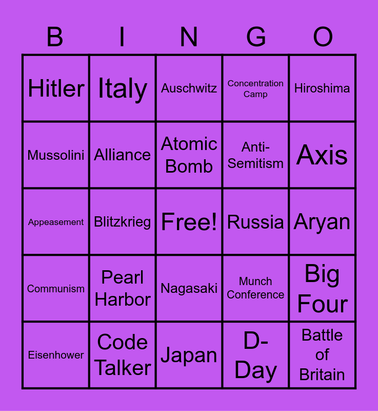 This bingo card has a free space and 25 words: Pearl Harbor, Japan, Atomic Bomb, Eisenhower, Hiroshima, Hitler, Mussolini, Italy, Russia, Nagasaki, Anti-Semitism, Appeasement, Munch Conference, Big Four, Alliance, Armistice, Aryan, Auschwitz, Axis, Blitzkrieg, Battle of Britain, Code Talker, Communism, Concentration Camp and D-Day.