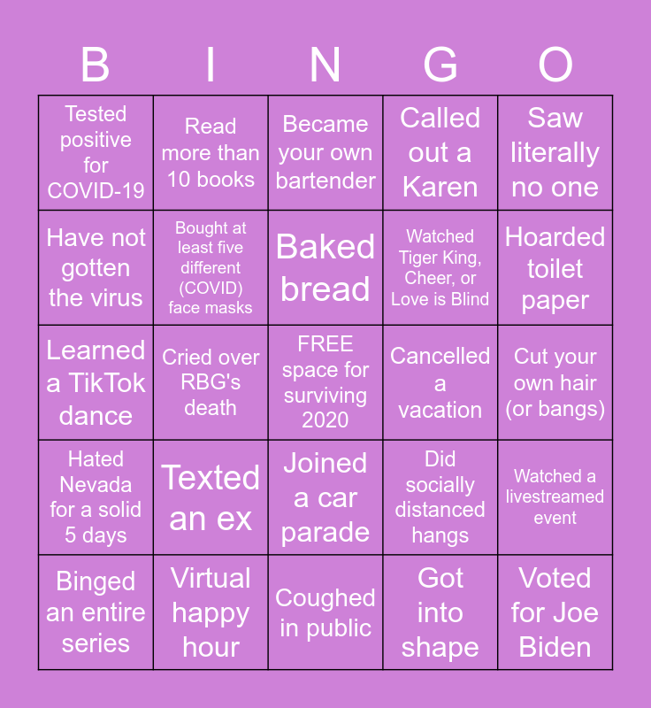 This bingo card has a free space and 24 words: Texted an ex, Virtual happy hour, Baked bread, Binged an entire series, Saw literally no one, Tested positive for COVID-19, Have not gotten the virus, Read more than 10 books, Cancelled a vacation, Joined a car parade, Watched Tiger King, Cheer, or Love is Blind, Learned a TikTok dance, Did socially distanced hangs, Watched a livestreamed event, Bought at least five different (COVID) face masks, Got into shape, Cut your own hair (or bangs), Became your own bartender, Hoarded toilet paper, Cried over RBG's death, Voted for Joe Biden, Hated Nevada for a solid 5 days, Called out a Karen and Coughed in public.