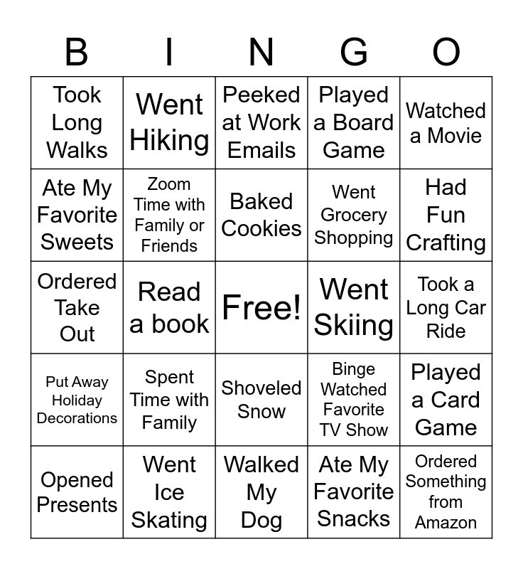 This bingo card has a free space and 24 words: Spent Time with Family, Went Ice Skating, Baked Cookies, Opened Presents, Watched a Movie, Took Long Walks, Ate My Favorite Sweets, Went Hiking, Went Skiing, Shoveled Snow, Went Grocery Shopping, Ordered Take Out, Binge Watched Favorite TV Show, Played a Card Game, Zoom Time with Family or Friends, Ate My Favorite Snacks, Took a Long Car Ride, Peeked at Work Emails, Had Fun Crafting, Read a book, Ordered Something from Amazon, Put Away Holiday Decorations, Played a Board Game and Walked My Dog.