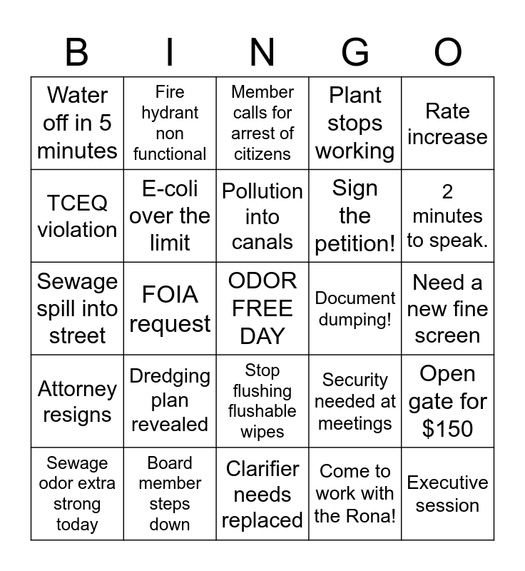 This bingo card has a free space and 24 words: Dredging plan revealed, Board member steps down, Pollution into canals, Sewage odor extra strong today, Rate increase, Water off in 5 minutes, TCEQ violation, Fire hydrant non functional, Document dumping!, Stop flushing flushable wipes, Sign the petition!, Sewage spill into street, Security needed at meetings, Open gate for $150, E-coli over the limit, Come to work with the Rona!, Need a new fine screen, Member calls for arrest of citizens, 2 minutes to speak., FOIA request, Executive session, Attorney resigns, Plant stops working and Clarifier needs replaced.