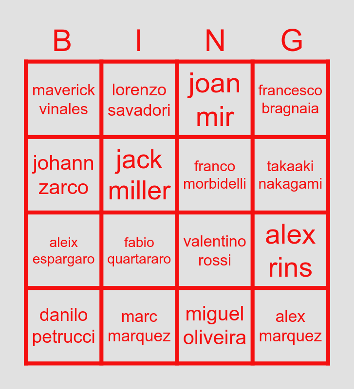 This bingo card has 16 words: marc marquez, alex rins, joan mir, maverick vinales, aleix espargaro, lorenzo savadori, valentino rossi, miguel oliveira, johann zarco, jack miller, danilo petrucci, francesco bragnaia, fabio quartararo, takaaki nakagami, franco morbidelli and alex marquez.