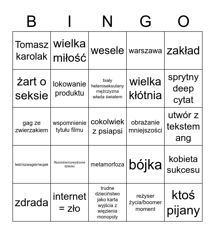 This bingo card has 25 words: Rezolutne/rozwydrzone dziecko, trudne dzieciństwo jako karta wyjścia z więzienia monopoly, biały heteroseksulany mężczyzna włada światem, zdrada, zakład, Tomasz karolak, żart o seksie, wielka miłość, obrażanie mniejszości, metamorfoza, wielka kłótnia, gag ze zwierzakiem, bójka, kobieta sukcesu, lokowanie produktu, ktoś pijany, utwór z tekstem ang, wesele, sprytny deep cytat, wspomnienie tytułu filmu, cokolwiek z psiapsi, internet = zło, teść/szwagier/wujek, warszawa and reżyser życia/boomer moment.