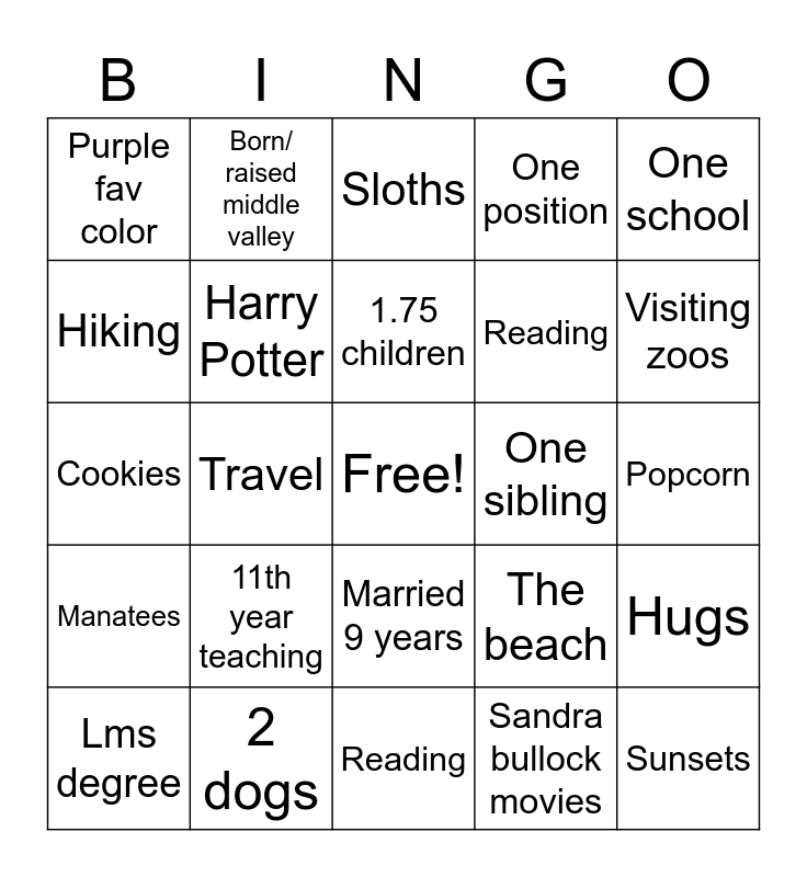 This bingo card has a free space and 24 words: 11th year teaching, 2 dogs, 1.75 children, Lms degree, One school, Purple fav color, Hiking, Born/ raised middle valley, One sibling, Married 9 years, Reading, Cookies, The beach, Hugs, Harry Potter, Sandra bullock movies, Popcorn, Sloths, Visiting zoos, Travel, Sunsets, Manatees, One position and Reading.