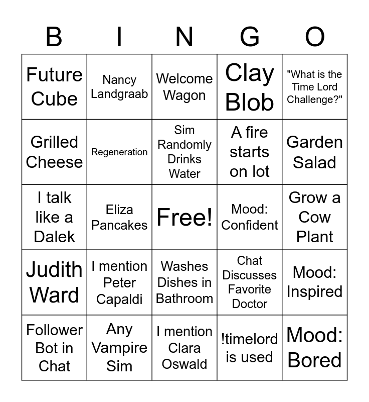 This bingo card has a free space and 24 words: I mention Peter Capaldi, Any Vampire Sim, Sim Randomly Drinks Water, Follower Bot in Chat, "What is the Time Lord Challenge?", Future Cube, Grilled Cheese, Nancy Landgraab, Mood: Confident, Washes Dishes in Bathroom, A fire starts on lot, I talk like a Dalek, Chat Discusses Favorite Doctor, Mood: Inspired, Regeneration, !timelord is used, Grow a Cow Plant, Welcome Wagon, Garden Salad, Eliza Pancakes, Mood: Bored, Judith Ward, Clay Blob and I mention Clara Oswald.