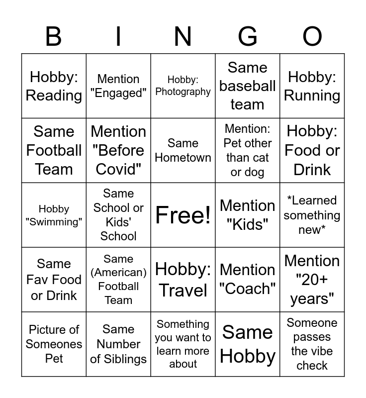 This bingo card has a free space and 24 words: Same (American) Football Team, Same Number of Siblings, Same Hometown, Picture of Someones Pet, Hobby: Running, Hobby: Reading, Same Football Team, Mention "Engaged", Mention "Kids", Hobby: Travel, Mention: Pet other than cat or dog, Hobby "Swimming", Mention "Coach", Mention "20+ years", Mention "Before Covid", Same Hobby, *Learned something new*, Hobby: Photography, Hobby: Food or Drink, Same School or Kids' School, Someone passes the vibe check, Same Fav Food or Drink, Same baseball team and Something you want to learn more about.