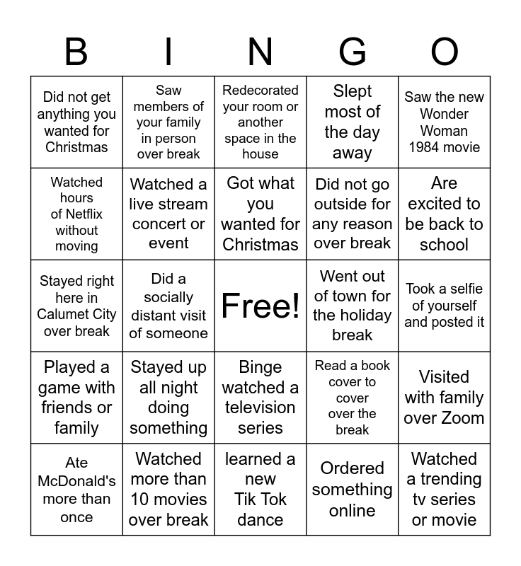 This bingo card has a free space and 24 words: Stayed up all night doing something, Watched more than 10 movies over break, Got what you wanted for Christmas, Ate McDonald's more than once, Saw the new Wonder Woman 1984 movie, Did not get anything you wanted for Christmas, Watched hours of Netflix without moving, Saw members of your family in person over break, Went out of town for the holiday break, Binge watched a television series, Did not go outside for any reason over break, Stayed right here in Calumet City over break, Read a book cover to cover over the break, Visited with family over Zoom, Watched a live stream concert or event, Ordered something online, Took a selfie of yourself and posted it, Redecorated your room or another space in the house, Are excited to be back to school, Did a socially distant visit of someone, Watched a trending tv series or movie, Played a game with friends or family, Slept most of the day away and learned a new Tik Tok dance.
