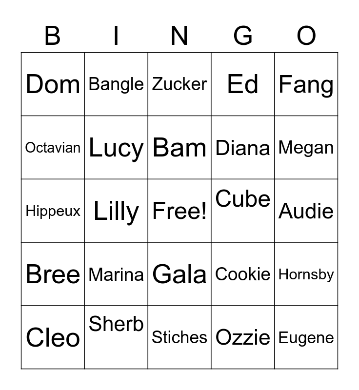 This bingo card has a free space and 24 words: Marina, Sherb, Bam, Cleo, Fang, Dom, Octavian, Bangle, Cube, Gala, Diana, Hippeux, Cookie, Hornsby, Lucy, Ozzie, Audie, Zucker, Megan, Lilly, Eugene, Bree, Ed and Stiches.