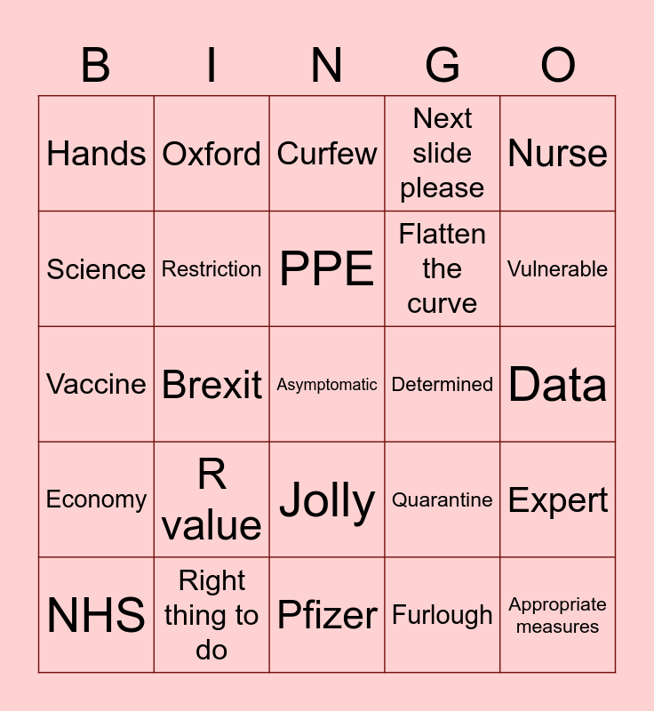 This bingo card has 25 words: R value, Pfizer, PPE, NHS, Nurse, Hands, Science, Oxford, Determined, Jolly, Flatten the curve, Vaccine, Quarantine, Expert, Restriction, Appropriate measures, Data, Curfew, Vulnerable, Brexit, Asymptomatic, Right thing to do, Economy, Next slide please and Furlough.