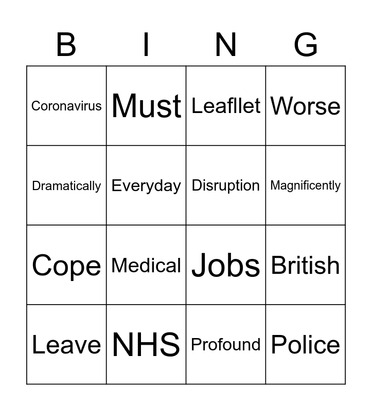 This bingo card has 24 words: Downing, Household, Profound, Police, Coronavirus, Must, Disruption, Worse, Cope, NHS, Stay, Magnificently, Gatherings, Ends meet, Jobs, Possible, Leave, Everyday, Stay at home, British, Dramatically, Medical, Leafllet and Follow the rules.