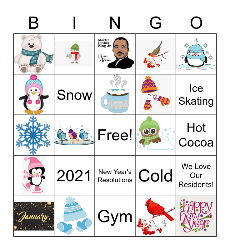 This bingo card has 16 images, a free space and 8 words: 2021, New Year's Resolutions, Cold, We Love Our Residents!, Snow, Hot Cocoa, Ice Skating and Gym.