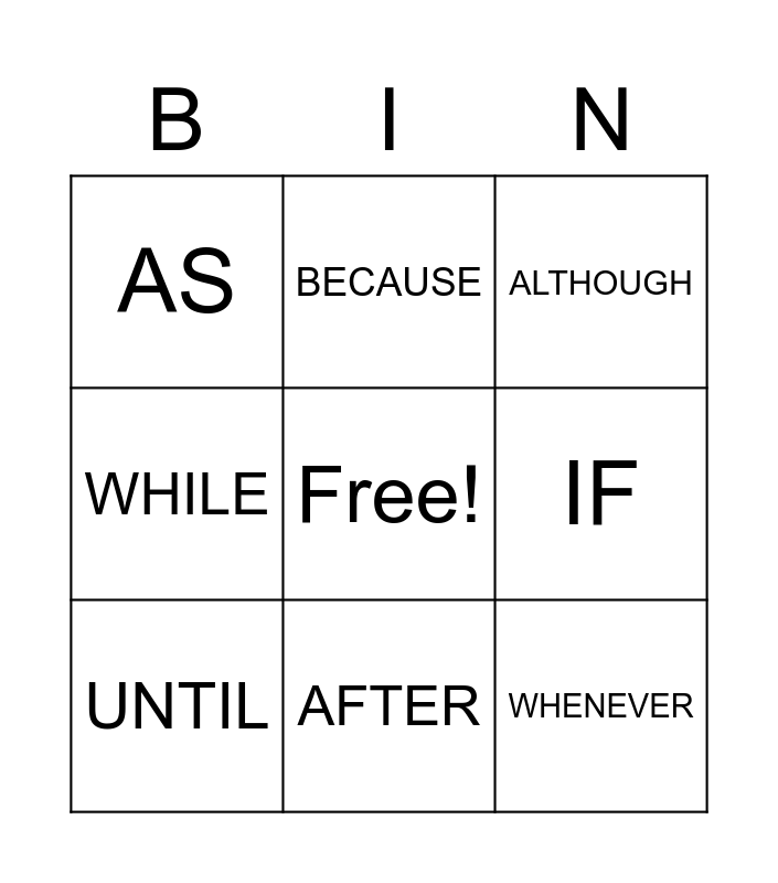 This bingo card has a free space and 10 words: AFTER, ALTHOUGH, AS, WHENEVER, WHILE, UNTIL, BECAUSE, BEFORE, IF and SINCE.