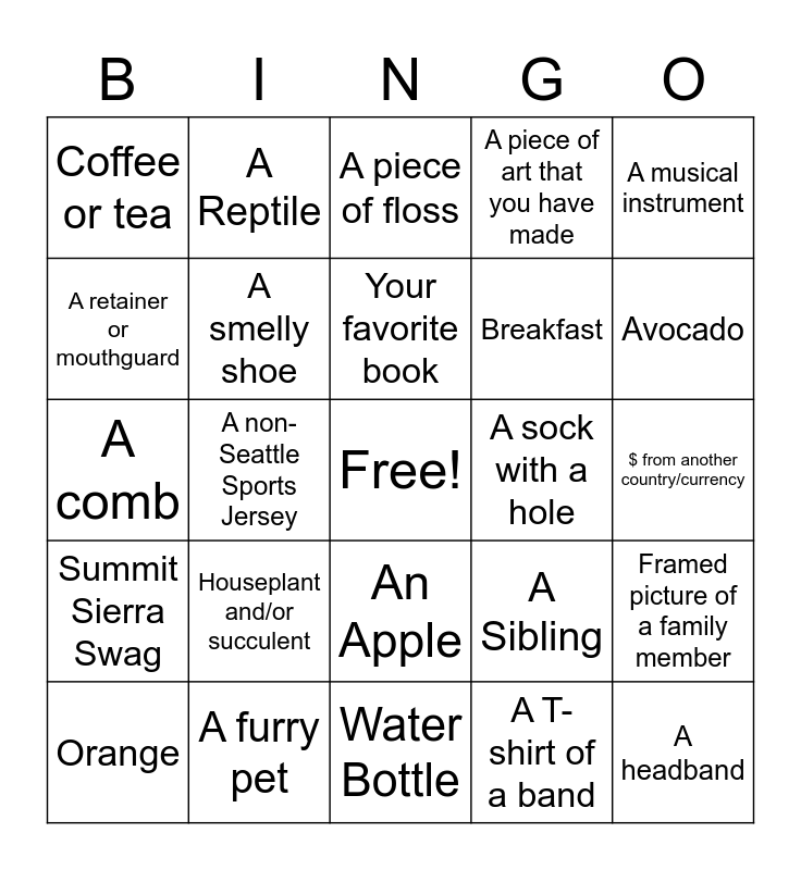 This bingo card has a free space and 24 words: Houseplant and/or succulent, A furry pet, Your favorite book, Orange, A musical instrument, Coffee or tea, A retainer or mouthguard, A Reptile, A sock with a hole, An Apple, Breakfast, A comb, A Sibling, Framed picture of a family member, A smelly shoe, A T-shirt of a band, $ from another country/currency, A piece of floss, Avocado, A non-Seattle Sports Jersey, A headband, Summit Sierra Swag, A piece of art that you have made and Water Bottle.