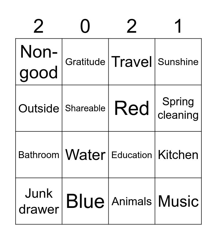 This bingo card has 16 words: Blue, Kitchen, Travel, Non-good, Bathroom, Gratitude, Education, Animals, Outside, Shareable, Junk drawer, Sunshine, Water, Spring cleaning, Red and Music.