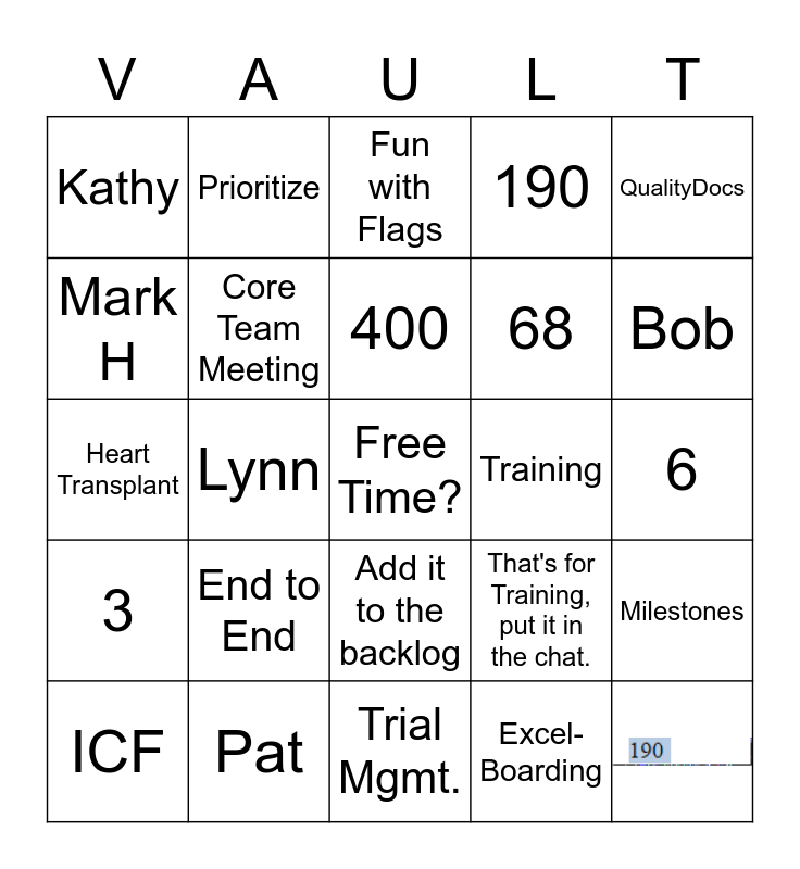 This bingo card has 1 images, a free space and 31 words: Excel-Boarding, Nov. 9th, Lynn, 6, 3, Core Team Meeting, QualityDocs, Milestones, Prioritize, One Big Happy Family, 400, Fun with Flags, Silpa, Lisa, Training, Bubble Tea, ICF, Heart Transplant, Add it to the backlog, End to End, That's for Training, put it in the chat., Moon Pies, 6, Pat, 190, 68, Mark H, Kathy, Trial Mgmt., March 9th and Bob.