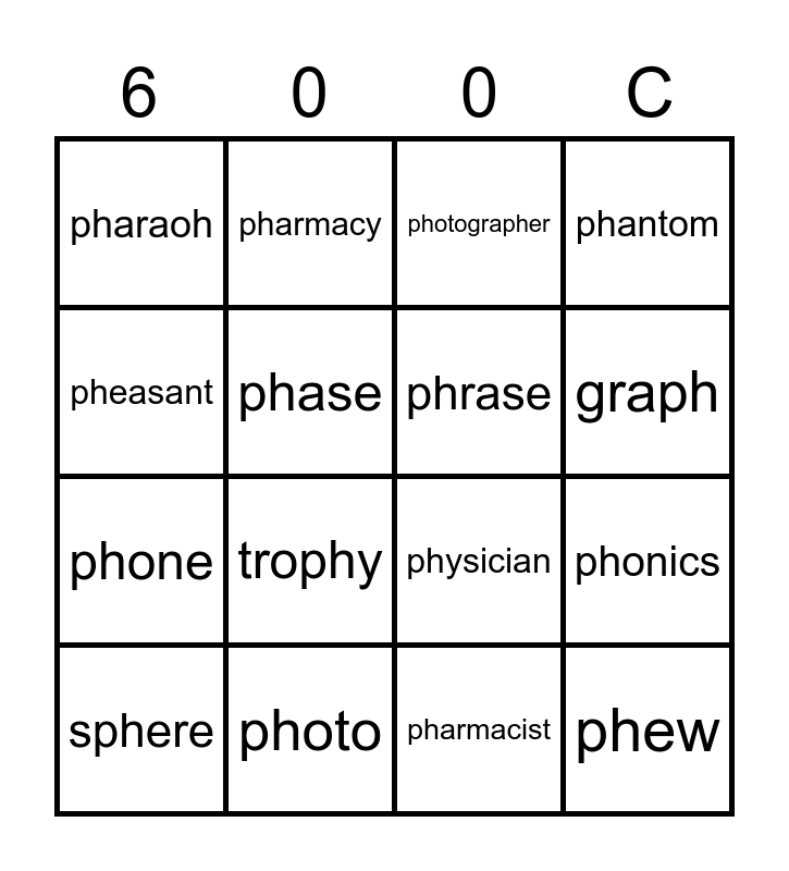 This bingo card has 16 words: photo, phonics, photographer, pharaoh, phone, pharmacy, physician, pharmacist, pheasant, phase, sphere, phantom, trophy, graph, phrase and phew.