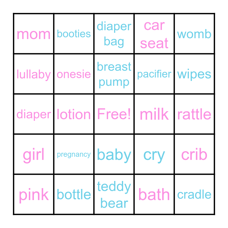 This bingo card has a free space and 29 words: pink, bib, lotion, boy, mom, diaper bag, onesie, pregnancy, milk, bottle, rattle, cradle, teddy bear, bath, wipes, dad, baby, girl, womb, diaper, cry, blue, pacifier, lullaby, car seat, booties, crib, breast pump and sippy cup.