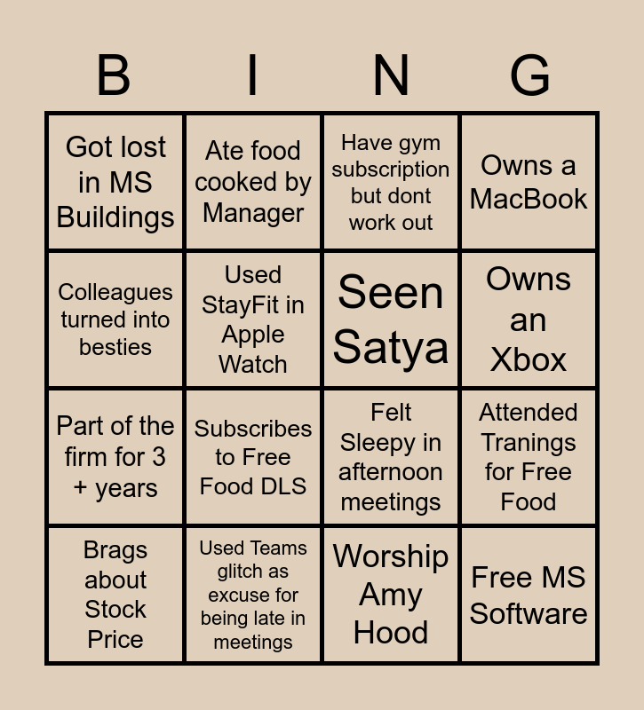 This bingo card has 16 words: Used Teams glitch as excuse for being late in meetings, Attended Tranings for Free Food, Have gym subscription but dont work out, Got lost in MS Buildings, Part of the firm for 3 + years, Ate food cooked by Manager, Felt Sleepy in afternoon meetings, Worship Amy Hood, Colleagues turned into besties, Used StayFit in Apple Watch, Brags about Stock Price, Owns a MacBook, Subscribes to Free Food DLS, Owns an Xbox, Seen Satya and Free MS Software.