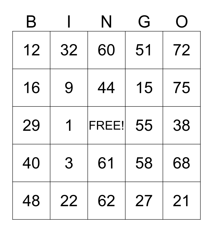 This bingo card has a free space and 24 words: 3, 22, 44, 48, 72, 12, 16, 32, 55, 61, 15, 29, 58, 68, 9, 27, 38, 60, 75, 1, 21, 40, 51 and 62.