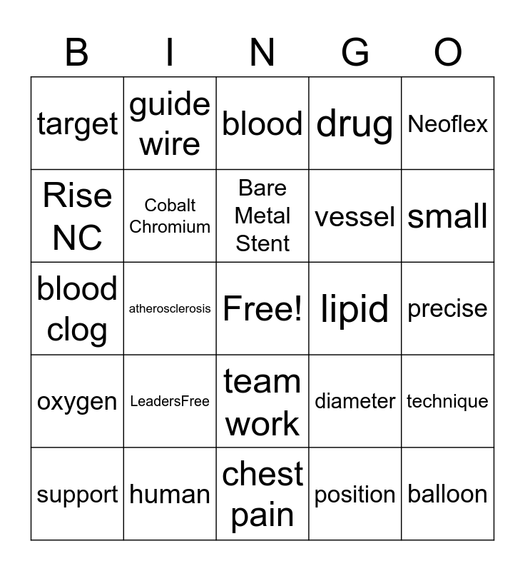 This bingo card has a free space and 75 words: heart attack, artery, blood, red blood cells, Biofreedom, Biosensors, Biomatrix, vein, white blood cells, valves, polymer, stent, Bare Metal Stent, Rise NC, Biofreedom Ultra, atherosclerosis, achieve, balloon, Microcatheter, Neoflex, BA9, blood clog, Cobalt Chromium, guide wire, drug, tissue, high bleeding risk, quality, patients, save life, cardiac, safety, leison, diameter, small, vessel, deliver, confident, precise, position, entry, rapid, exchange, product, unique, healing, support, target, research, trial, clinical, team work, innovation, goal, sales, perfomance, outcome, improve, simplify, focus, LeadersFree, registry, device, benefit, wall, lipid, force, thin, thickness, technique, oxygen, human, stroke, chest pain and lifestyle.