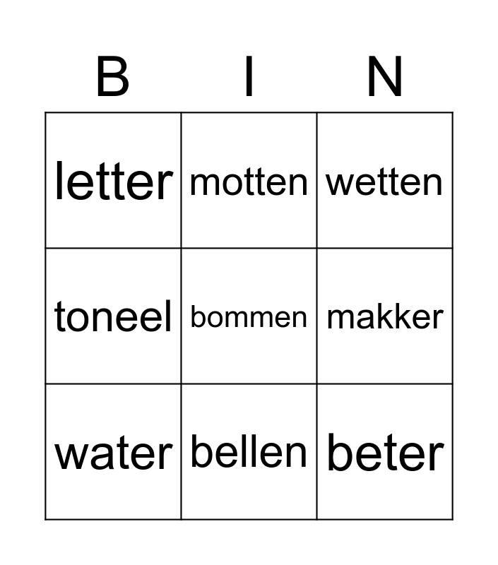 This bingo card has a free space and 17 words: bomen, moten, wetten, letter, balen, toneel, tomaten, water, bellen, makker, gezellig, wallen, beter, motten, ballen, maken and weten.