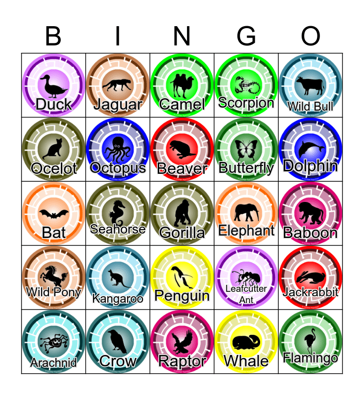 This bingo card has 25 images, a free space and 25 words: Arachnid, Kangaroo, Beaver, Leafcutter Ant, Dolphin, Duck, Jaguar, Camel, Butterfly, Jackrabbit, Bat, Scorpion, Flamingo, Rooster, Octopus, Penguin, Elephant, Wild Bull, Wild Pony, Seahorse, Raptor, Whale, Baboon, Ocelot and Crow.