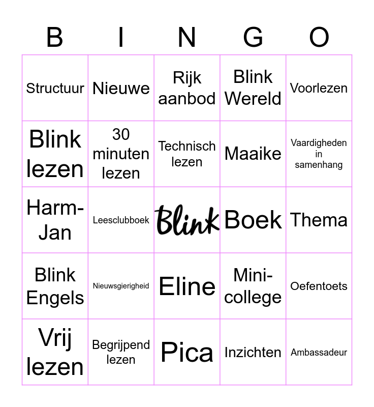 This bingo card has a free space and 24 words: Nieuwsgierigheid, Begrijpend lezen, Technisch lezen, Vrij lezen, Voorlezen, Structuur, Blink lezen, Nieuwe, Boek, Eline, Maaike, Harm-Jan, Mini-college, Oefentoets, 30 minuten lezen, Inzichten, Thema, Rijk aanbod, Vaardigheden in samenhang, Leesclubboek, Ambassadeur, Blink Engels, Blink Wereld and Pica.