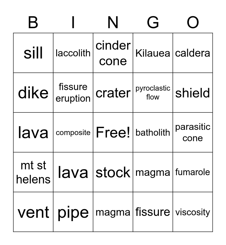 This bingo card has a free space and 24 words: lava, pipe, crater, vent, caldera, sill, dike, laccolith, batholith, stock, pyroclastic flow, lava, magma, fumarole, fissure eruption, fissure, parasitic cone, cinder cone, shield, composite, viscosity, mt st helens, Kilauea and magma.