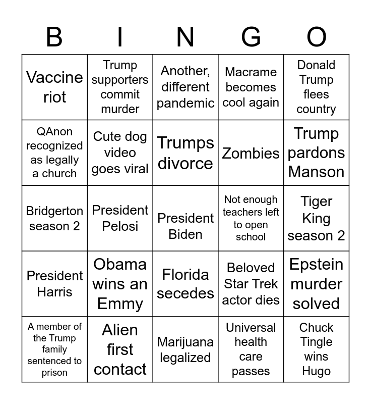 This bingo card has a free space and 24 words: A member of the Trump family sentenced to prison, Obama wins an Emmy, Trumps divorce, Universal health care passes, Donald Trump flees country, Vaccine riot, Trump supporters commit murder, Another, different pandemic, Not enough teachers left to open school, Tiger King season 2, Bridgerton season 2, Cute dog video goes viral, Beloved Star Trek actor dies, Epstein murder solved, QAnon recognized as legally a church, Alien first contact, Marijuana legalized, Macrame becomes cool again, Trump pardons Manson, President Harris, President Pelosi, Florida secedes, Zombies and Chuck Tingle wins Hugo.