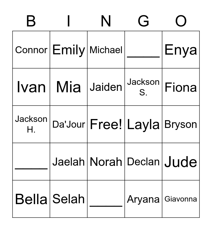 This bingo card has a free space and 24 words: Jaelah, Selah, Jaiden, Bella, Enya, Connor, Ivan, Emily, Layla, Norah, Jackson S., Jackson H., Declan, Jude, Mia, Aryana, Bryson, Michael, Fiona, Da'Jour, Giavonna, ____, ____ and ____.