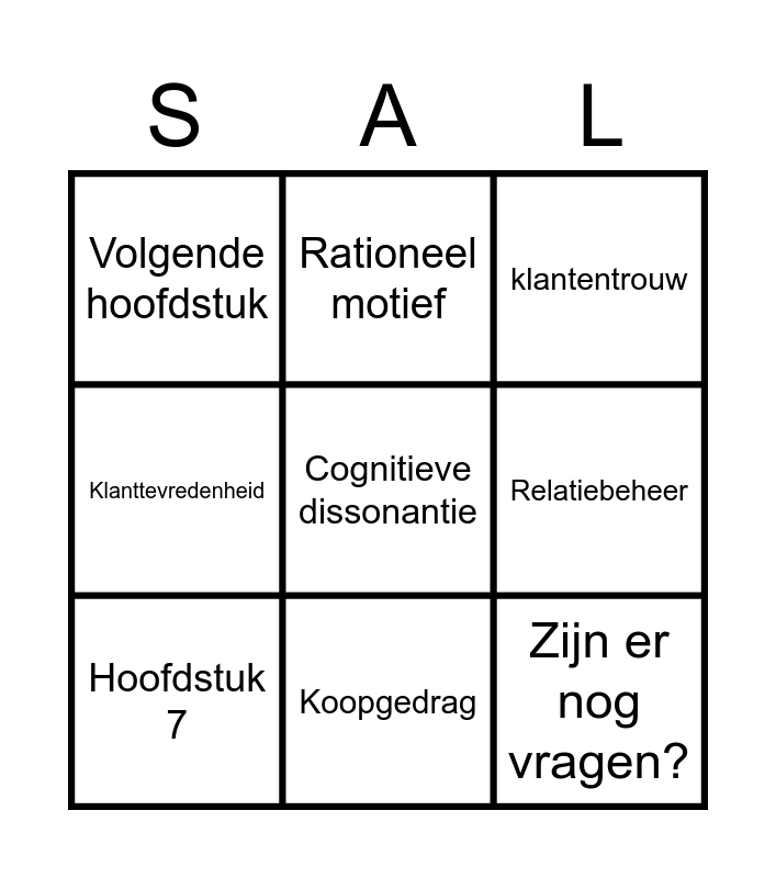 This bingo card has 15 words: Klant is koning, Retentie, klantentrouw, Volgende hoofdstuk, Koopgedrag, Cognitieve dissonantie, Klantenbinding, Loyaliteit, Relatiebeheer, Zijn er nog vragen?, Perceptie, Klanttevredenheid, Hoofdstuk 7, Rationeel motief and Database.