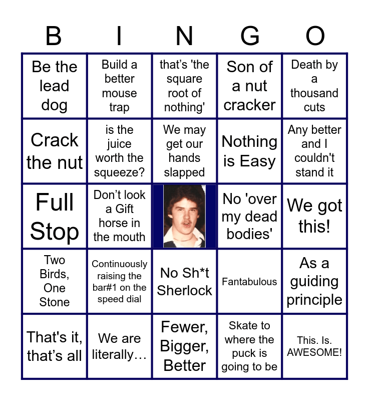 This bingo card has a free space and 29 words: That's it, that’s all, It takes a village, Don’t look a Gift horse in the mouth, Inch deep, mile wide, Be the lead dog, that’s 'the square root of nothing', is the juice worth the squeeze?, Continuously raising the bar#1 on the speed dial, No 'over my dead bodies', We are literally…, We got this!, This. Is. AWESOME!, Fewer, Bigger, Better, Skate to where the puck is going to be, Any better and I couldn't stand it, You're gonna wanna…, No Sh*t Sherlock, Two Birds, One Stone, Death by a thousand cuts, Full Stop, Fantabulous, Like, OMG, Nothing is Easy, Crack the nut, Son of a nut cracker, Build a better mouse trap, As a guiding principle, We may get our hands slapped and Mr. Customer (Mrs. Customer).