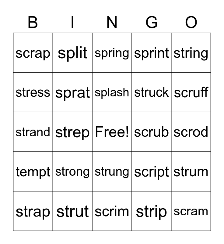 This bingo card has a free space and 24 words: strap, strong, splash, strip, string, scrap, split, spring, scrub, scrod, strand, sprat, script, strum, stress, strut, scrim, sprint, scruff, tempt, strep, strung, struck and scram.