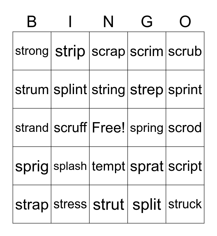 This bingo card has a free space and 24 words: strap, splash, string, split, scrub, strong, strip, scrap, spring, scrod, strand, splint, sprat, script, strum, stress, strut, scrim, sprint, sprig, scruff, tempt, strep and struck.