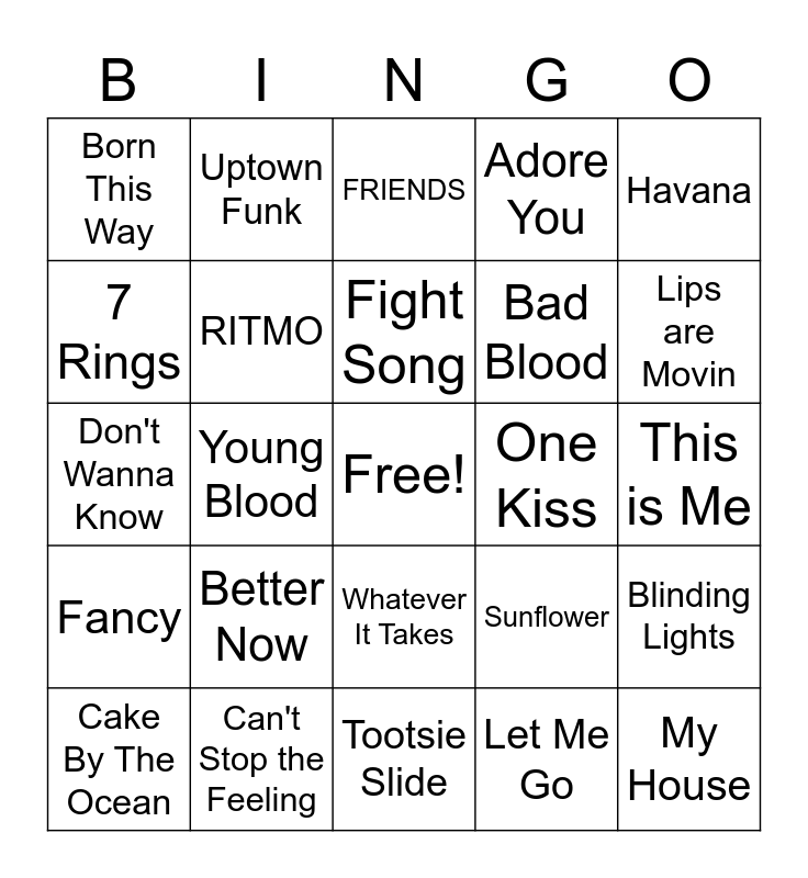 This bingo card has a free space and 72 words: Old Town Road, Uptown Funk, Young Blood, Beautiful People, This Is What You Came For, 24K Magic, Adore You, Señorita, Bad Blood, Reggaetón Lento, Cake By The Ocean, Reggaetón Lento, Lips are Movin, Born This Way, Sucker, Don't Wanna Know, Sunflower, Havana, Breathin, This is Me, Better Now, My House, Blinding Lights, Call Me Maybe, Sugar, Make Some Noise, Love Me Like You Do, Happy, Shallow, I Love It, Can't Stop the Feeling, Thunder, Close to Me, I Like Me Better, Let Me Go, If I Can't Have You, Mine, Ex's and Oh's, 7 Rings, Truth Hurts, Whatever It Takes, High Hopes, Only Human, Who Do You Love, Disturbia, Fancy, Me!, New Rules, No Promises, Party in the USA, Dance Monkey, Kids, Best Day of My Life, One Kiss, Savage Love, How Long, FRIENDS, Fight Song, Say So, Rain on Me, Sunday Best, Memories, Supalonely, Tootsie Slide, Everything I Wanted, Stupid Love, RITMO, Falling, Cuz I Love You, Panini, Physical and What a Man Gotta Do.