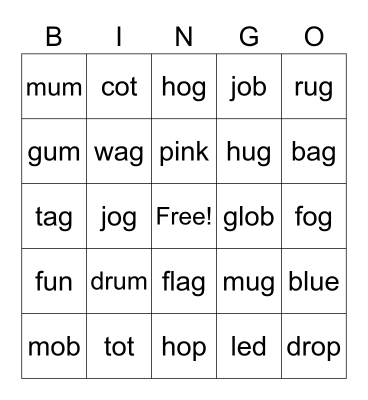 This bingo card has a free space and 29 words: mob, blob, jog, bot, mum, hog, wag, drum, glob, tot, fog, drop, hop, led, bag, bun, flag, fun, rug, tag, mug, cub, hug, gum, job, cot, blue, pink and two.