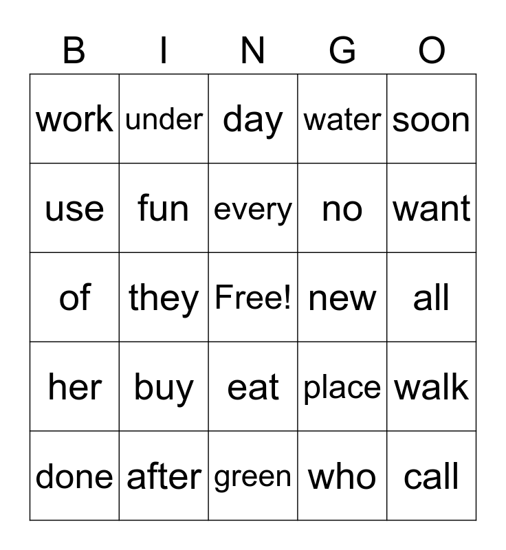 This bingo card has a free space and 24 words: buy, after, every, done, soon, work, use, under, new, eat, no, of, place, walk, fun, who, all, day, want, they, call, her, water and green.