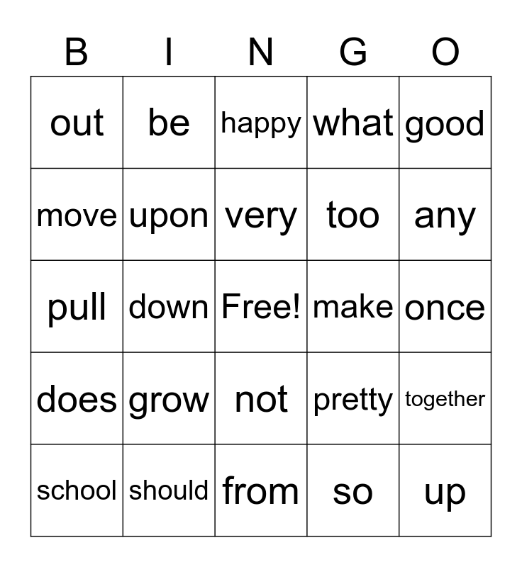 This bingo card has a free space and 24 words: grow, should, very, school, good, out, move, be, make, not, too, pull, pretty, together, upon, so, once, happy, any, down, up, does, what and from.