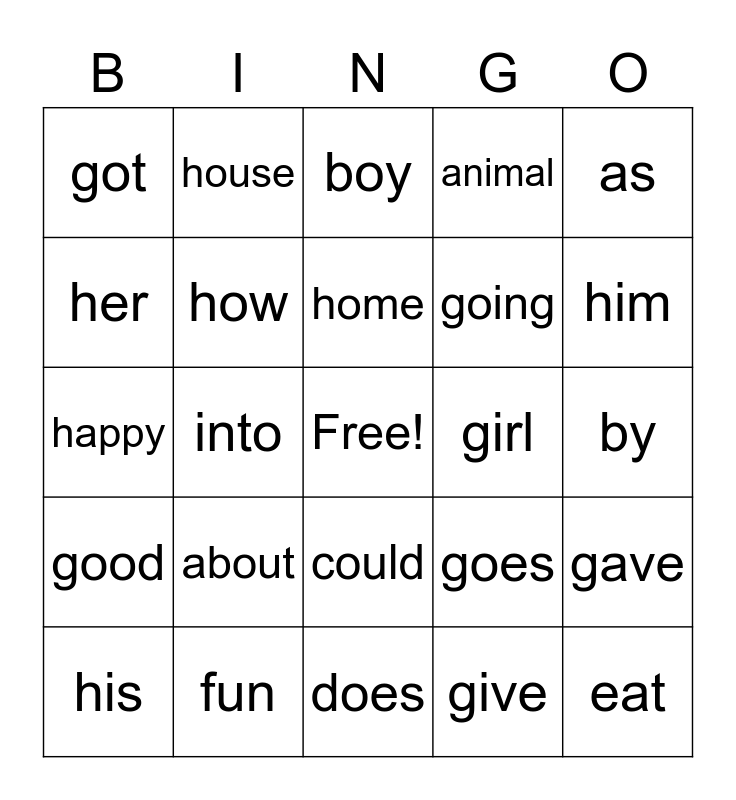 This bingo card has a free space and 24 words: about, fun, home, his, as, got, her, house, girl, could, going, happy, goes, gave, how, give, by, boy, him, into, eat, good, animal and does.