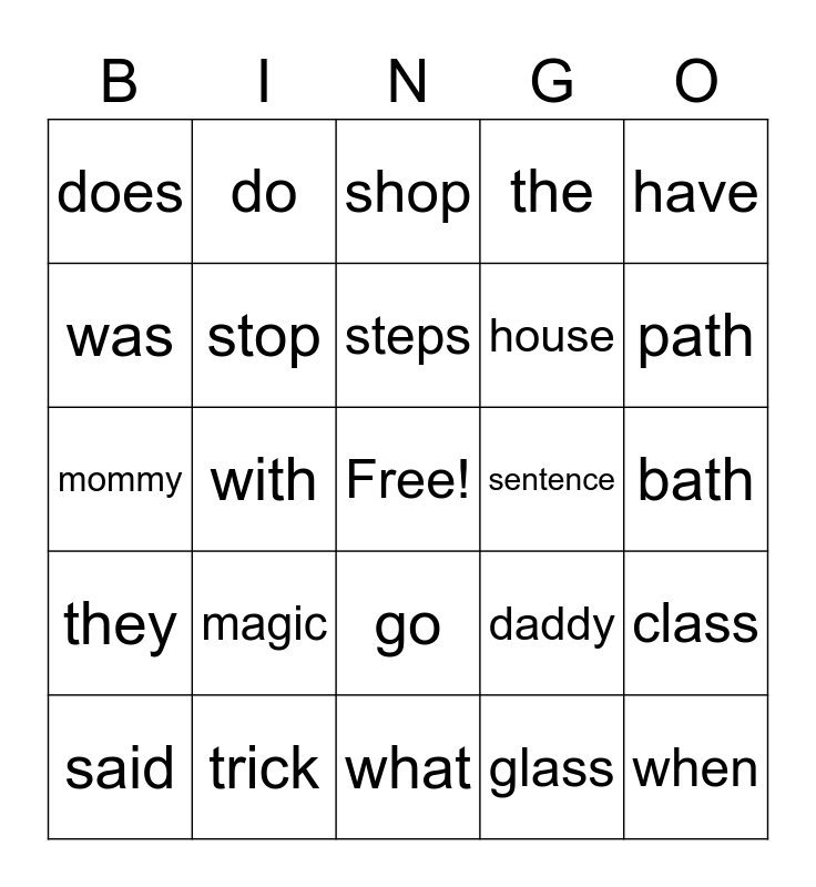 This bingo card has a free space and 24 words: magic, trick, steps, said, have, does, was, do, sentence, go, house, mommy, daddy, class, stop, glass, bath, shop, path, with, when, they, the and what.