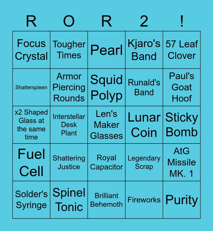 This bingo card has a free space and 24 words: Shattering Justice, Spinel Tonic, Squid Polyp, Solder's Syringe, 57 Leaf Clover, Focus Crystal, Shatterspleen, Tougher Times, Lunar Coin, Royal Capacitor, Runald's Band, x2 Shaped Glass at the same time, Legendary Scrap, AtG Missile MK. 1, Armor Piercing Rounds, Fireworks, Sticky Bomb, Pearl, Paul's Goat Hoof, Interstellar Desk Plant, Purity, Fuel Cell, Kjaro's Band and Brilliant Behemoth.