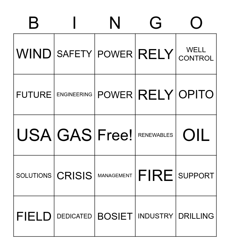 This bingo card has a free space and 31 words: BOSIET, MARITIME, GAS, SECTORS, WIND, POWER, ENGINEERING, FIRE, RENEWABLES, INDUSTRY, OIL, DRILLING, HEALTH, TRAINING, OPITO, NEW, SUPPORT, CRISIS, SOLUTIONS, MANAGEMENT, WELL CONTROL, GLOBAL, FIELD, SAFETY, RELY, FUTURE, RELY, USA, DEDICATED, POWER and WORLD.
