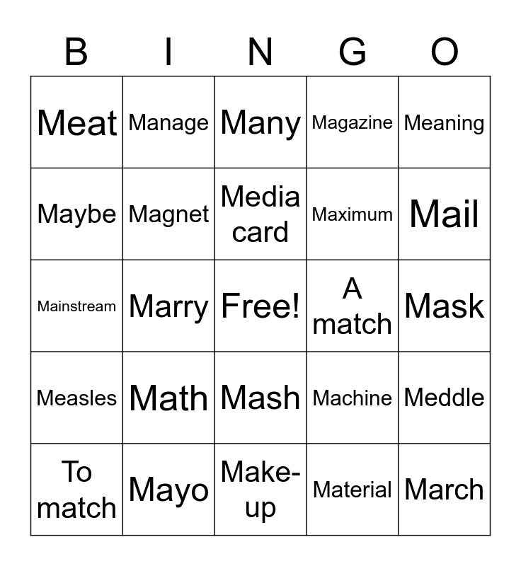 This bingo card has a free space and 33 words: Make, Medal, Marry, Be mean, Measles, Magnet, Meaning, To match, Manage, Measure, Media card, Many, Make-shift, Majority, A match, Mail, Mayo, Mainstream, Math, Machine, Mash, Man, Meat, Mask, Make-up, March, Magazine, Maximum, Maybe, Meddle, Magic, Material and Marbles.