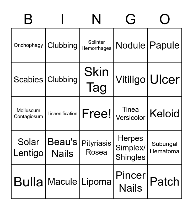 This bingo card has a free space and 68 words: Wheal, Patch, Alopecia Areata, Vesicle, Kerion, Leukonychia, Clubbing, Dermatofibroma, Skin Tag, Cherry Angiomas, Pityriasis Rosea, Fissure, Keloid, Papule, Erosion, Scabies, Lichenification, Onchophagy, Nummular Dermatitis, Beau's Nails, Vitiligo, Herpes Simplex/ Shingles, Solar Lentigo, Petechiae, Urticaria, Spider Angiomas, Paronychia, Poikiloderma, Subungal Hematoma, Onchocryptosis, Splinter Hemorrhages, Crust, Cyst, Psoriasis, Nodule, Trichotillomania, Melanoma, Bulla, Ulcer, Molluscum Contagiosum, Spider Veins, Jaundice, Clubbing, Excoriations, Tinea Capitus (Ringworm), Scar, Seborrheic Dermatitis, Basal cell Carcinoma, Tinea Versicolor, Macule, Scale, Actinic Keratosis, Oncholysis, Lipoma, Pustule, Bacterial Folliculitis, Pincer Nails, Burrow, Benign Melanocytic Nevi, Koilonchia, Terry's Nails, Furuncles, Squamous Cell Carcinoma, Purpura, Salmon Patch, Onchomycosis, Onychogryphosis and Acne.