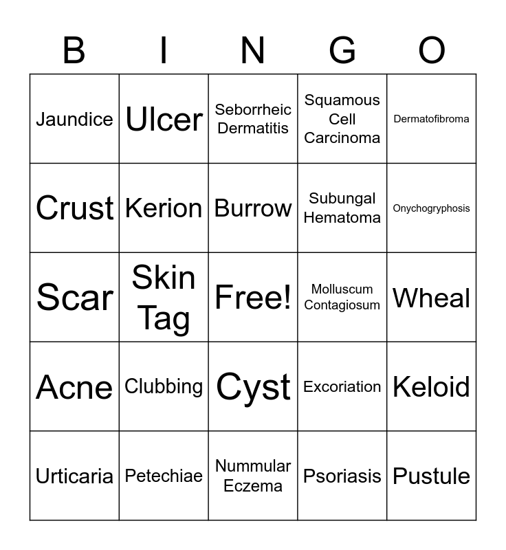 This bingo card has a free space and 66 words: Scabies, Nodule, Oncholysis, Keloid, Fissure, Furuncle, Ulcer, Pincer Nails, Burrow, Spider Veins, Cyst, Onchophagy, Wheal, Dermatofibroma, Vesicle, Crust, Skin Tag, Jaundice, Macule, Subungal Hematoma, Clubbing, Acne, Squamous Cell Carcinoma, Lipoma, Onychocryptosis, Solar Lentigo, Trichotillomania, Terry's Nails, Pustule, Spider Angiomas, Urticaria, Vitiligo, Bulla, Poikiloderma, Excoriation, Petechiae, Koilonchia, Scar, Psoriasis, Cherry Angiomas, Kerion, Alopecia Totalis, Molluscum Contagiosum, Beau's Nails, Papule, Purpura, Onychogryphosis, Onchomycosis, Tinea Versicolor, Benign Melanocytic Nevi, Lichenification, Basal Cell Carcinoma, Melanoma, Leukonychia, Paronychia, Patch, Erosion, Timea Capitus (Ringworm), Seborrheic Dermatitis, Nummular Eczema, Alopecia Areata, Bacterial Folliculitis, Splinter Hemorrhages, Plaque, Pityriasis Rosea and Herpes Simplex/Shingles.