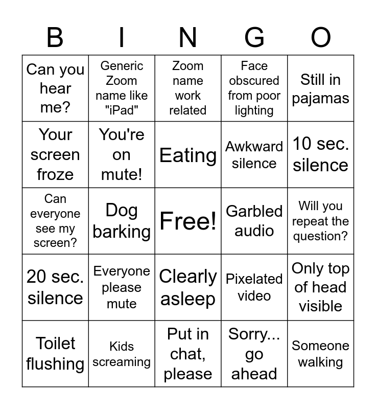 This bingo card has a free space and 24 words: Everyone please mute, Kids screaming, Eating, Toilet flushing, Still in pajamas, Can you hear me?, Your screen froze, Generic Zoom name like "iPad", Garbled audio, Clearly asleep, Awkward silence, Can everyone see my screen?, Pixelated video, Only top of head visible, You're on mute!, Sorry... go ahead, Will you repeat the question?, Zoom name work related, 10 sec. silence, Dog barking, Someone walking, 20 sec. silence, Face obscured from poor lighting and Put in chat, please.