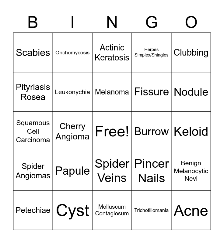 This bingo card has a free space and 74 words: Vitiligo, Scabies, Actinic Keratosis, Atrophy, Solar Lentigo, Poikiloderma, Keloid, Scale, Petechiae, Alopecia Areata, Pustule, Lichenification, Melanoma, Pityriasis Rosea, Furuncle, Cherry Angioma, Macule, Nodule, Jaundice, Squamous Cell Carcinoma, Leukonychia, Onchomycosis, Herpes Simplex/Shingles, Urticaria, Acne, Onychogryphosis, Terry's Nails, Ulcer, Crust, Seborrheic Dermatitis, Clubbing, Vesicle, Subungal Hematoma, Purpura, Bacterial Folliculitis, Trichotillomania, Tinea Capitus (Ringworm), Erosion, Koilonchia, Scar, Molluscum Contagiosum, Cyst, Bulla, Kerion, Lipoma, Scabies, Nummular Dermatitis, Papule, Onchophagy, Leukonychia, Splinter Hemorrhages, Beau's Nails, Keloid, Basal Cell Carcinoma, Patch, Petechiae, Spider Veins, Clubbing, Wheal, Benign Melanocytic Nevi, Fissure, Salmon Patch, Spider Angiomas, Psoriasis, Burrow, Nodule, Tinea Versicolor, Macule, Pincer Nails, Excoriations, Onchocryptosis, Skin Tag, Poikiloderma and Dermatofibroma.