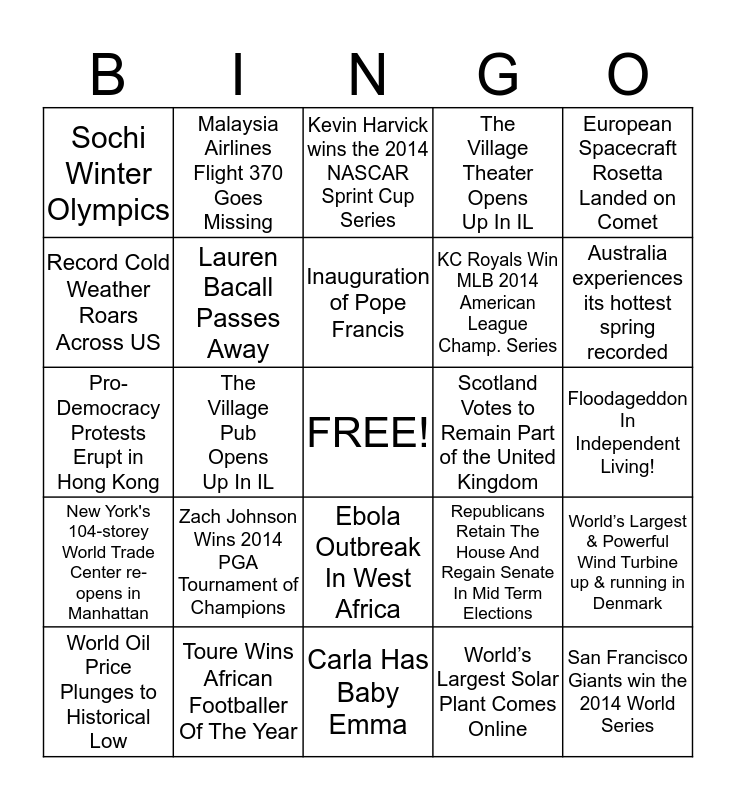 This bingo card has a free space and 24 words: Zach Johnson Wins 2014 PGA Tournament of Champions, Toure Wins African Footballer Of The Year, Inauguration of Pope Francis, World Oil Price Plunges to Historical Low, European Spacecraft Rosetta Landed on Comet, Sochi Winter Olympics, Record Cold Weather Roars Across US, Malaysia Airlines Flight 370 Goes Missing, Scotland Votes to Remain Part of the United Kingdom, Ebola Outbreak In West Africa, KC Royals Win MLB 2014 American League Champ. Series, Pro-Democracy Protests Erupt in Hong Kong, Republicans Retain The House And Regain Senate In Mid Term Elections, World’s Largest & Powerful Wind Turbine up & running in Denmark, Lauren Bacall Passes Away, World’s Largest Solar Plant Comes Online, Floodageddon In Independent Living!, Kevin Harvick wins the 2014 NASCAR Sprint Cup Series, Australia experiences its hottest spring recorded, The Village Pub Opens Up In IL, San Francisco Giants win the 2014 World Series, New York's 104-storey World Trade Center re-opens in Manhattan, The Village Theater Opens Up In IL and Carla Has Baby Emma.