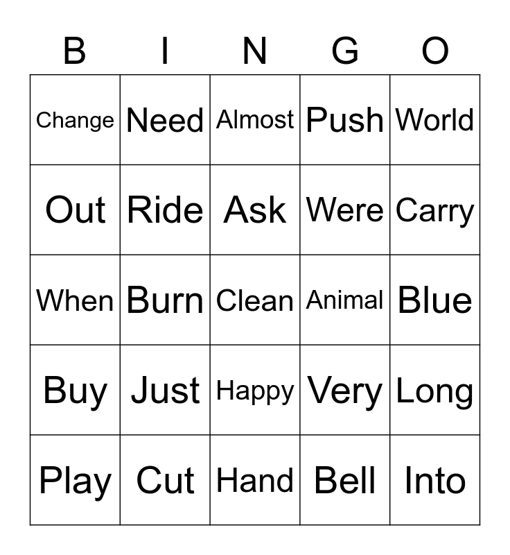This bingo card has 25 words: Just, Hand, Ask, Play, World, Change, Out, Need, Animal, Happy, Were, When, Very, Long, Ride, Into, Blue, Almost, Carry, Burn, Clean, Cut, Buy, Push and Bell.
